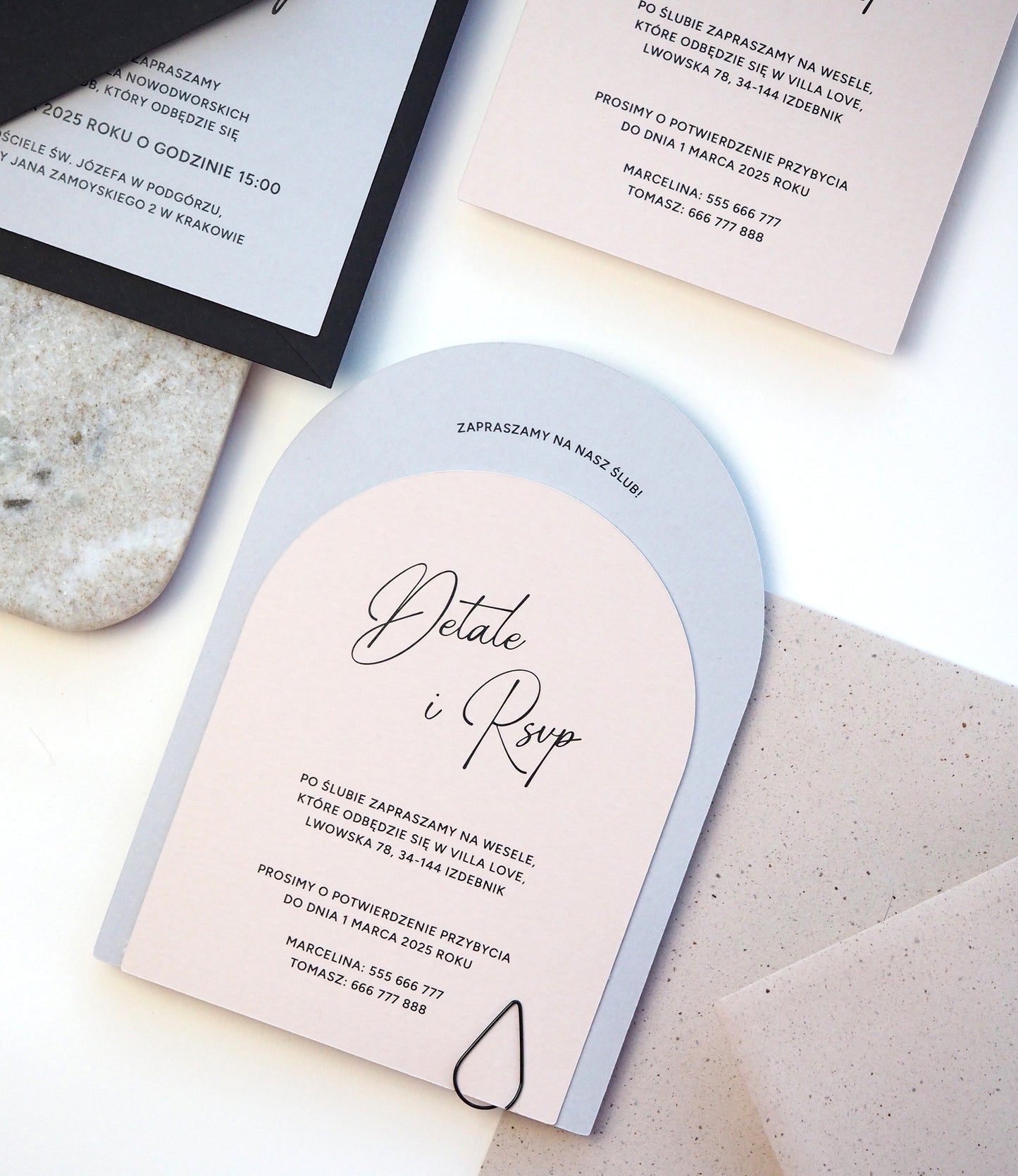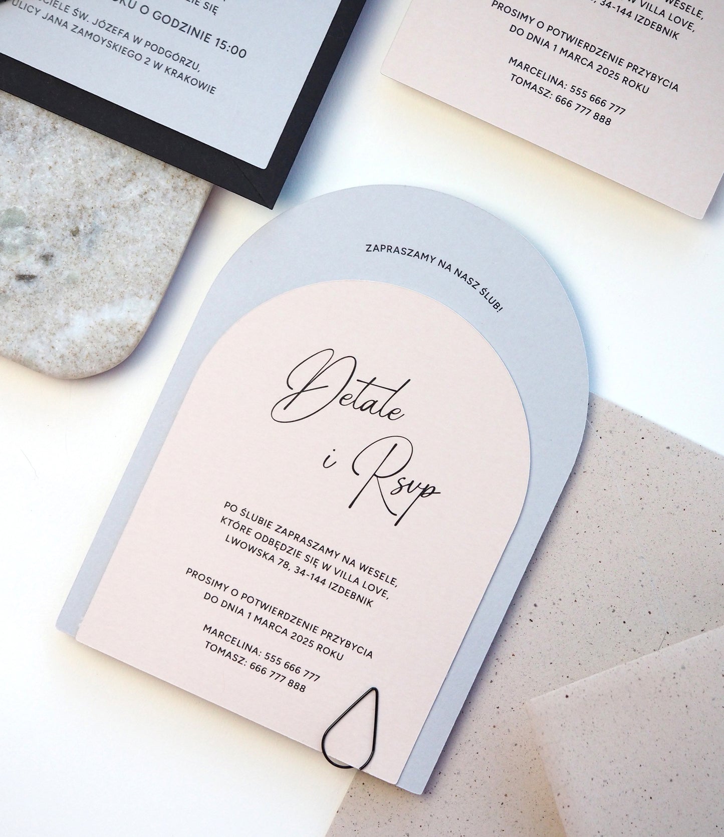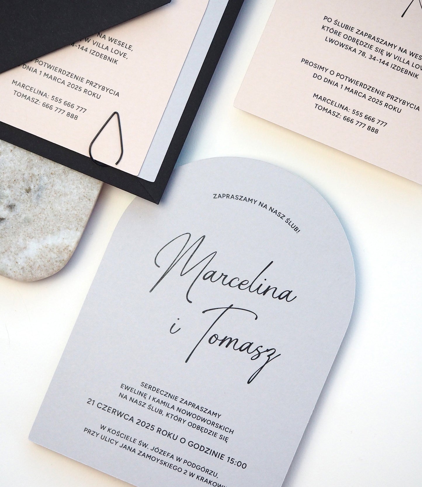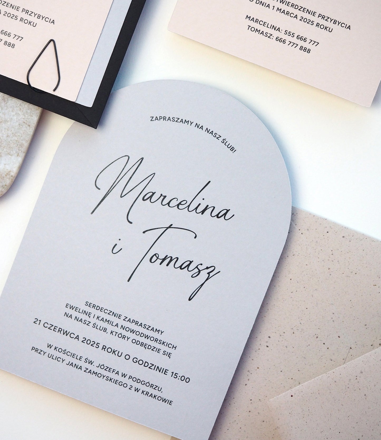 Eleganckie i nowoczesne zaproszenie ślubne Archy o unikalnym kształcie łuku, które łączy w sobie minimalizm i stylową typografię. Delikatne pastelowe odcienie w połączeniu z kontrastującymi akcentami tworzą wyjątkową kompozycję, idealną dla par ceniących subtelną elegancję.