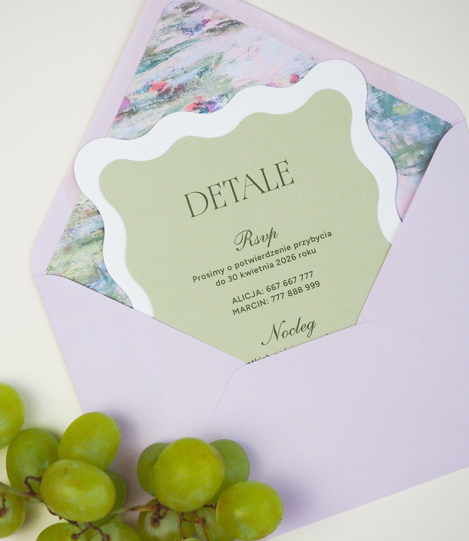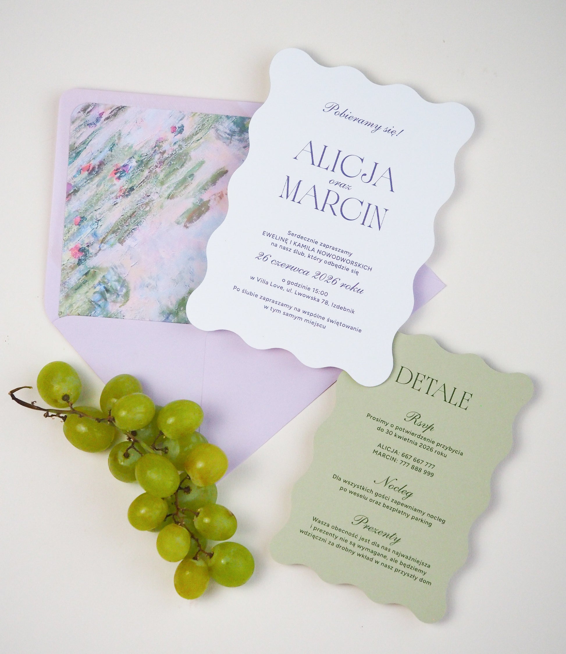 Subtelne, nowoczesne i z nutą artystycznego wdzięku – zaproszenie Lagune to propozycja dla par, które cenią oryginalność i delikatny styl. Karty o falowanych krawędziach przyciągają uwagę swoją nietypową formą, a koperta w kolorze pastelowego fioletu z malarską wkładką przypominającą impresjonistyczny pejzaż dopełnia kompozycję, nadając jej wyjątkowo romantyczny charakter.