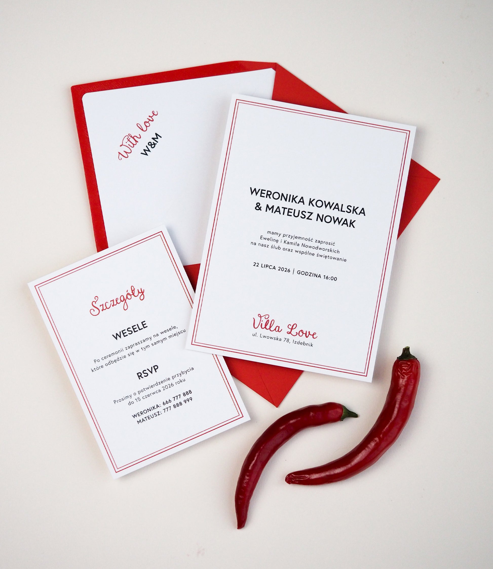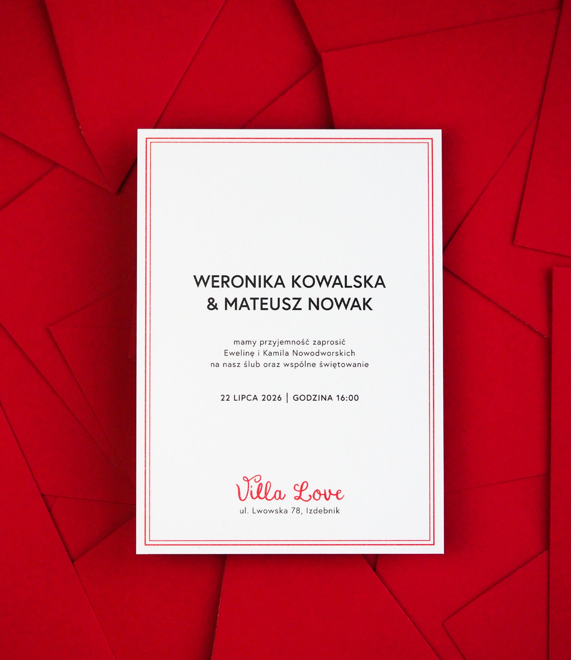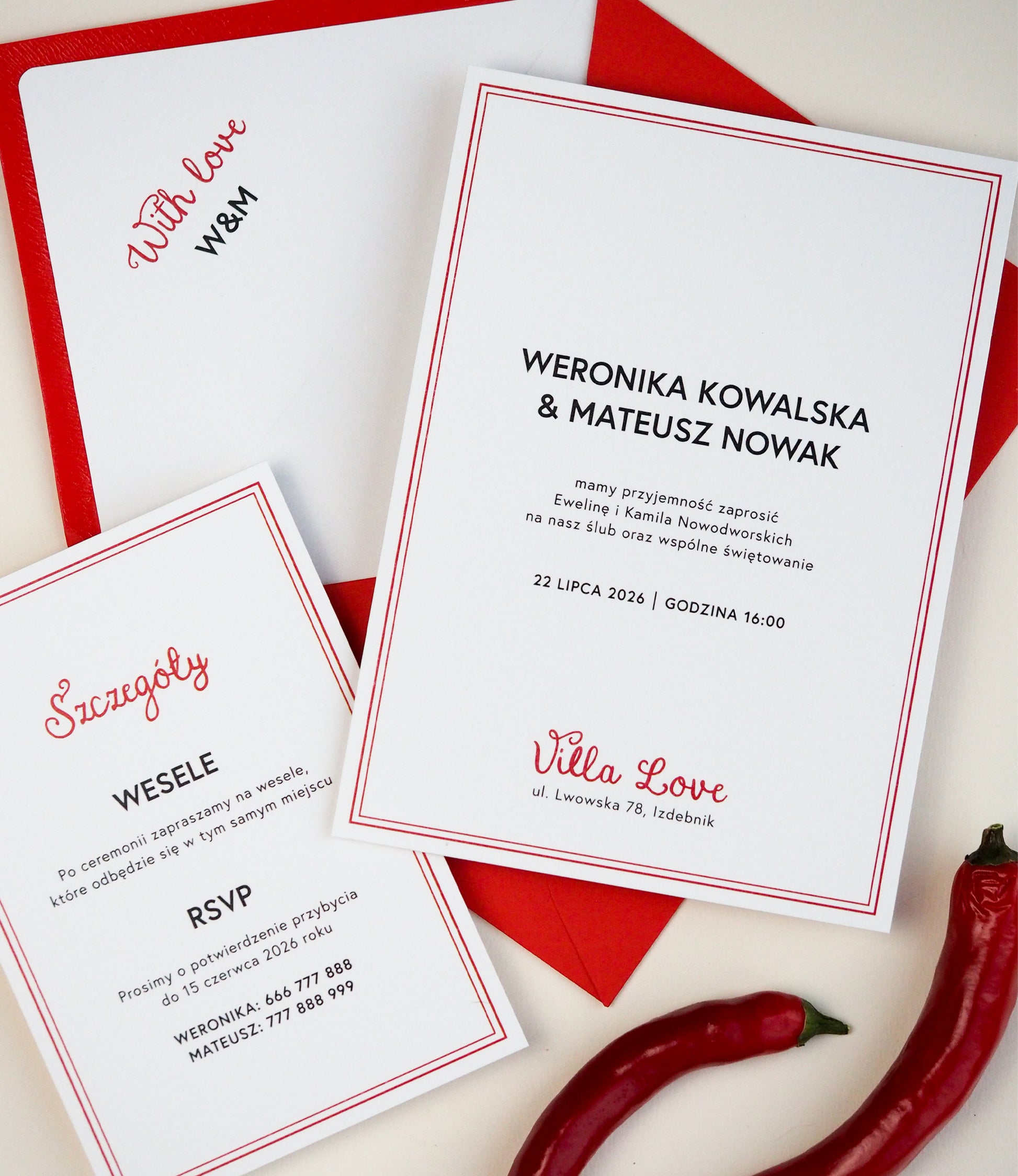 Zmysłowe, odważne i pełne elegancji – zaproszenie Cherry to idealna propozycja dla par, które kochają odważny styl i charakter. Połączenie czystej bieli, głębokiej czerni i intensywnej czerwieni tworzy nowoczesny, kontrastowy projekt o wyjątkowym wyrazie. Minimalistyczny układ tekstu, stylowa typografia i czerwone akcenty nadają całości subtelnej zmysłowości.